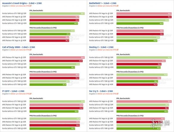 他们分别使用NVIDIA GeForce GTX 1080和AMD Radeon Vega 64两张显卡对目前支持HDR功能的主流大作进行了测试,3840x2160 4K的分辨率下,开启预设最高画面效果,两张显卡都有着不同程度的帧数下降,N卡相对之下更加明显,平均降幅达12%。