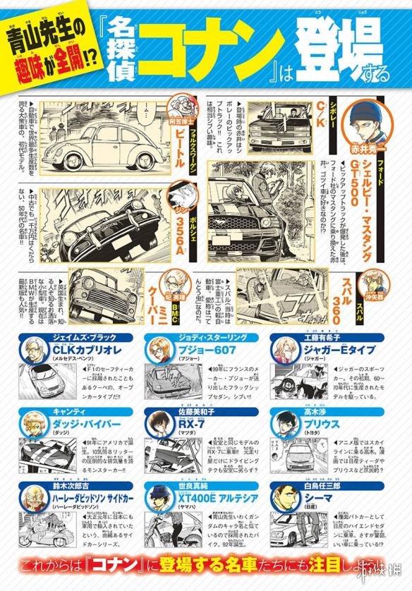 以“柯南世界的名车”为主题的特辑里,青山刚昌老师进入白色RX-7跑车中,与担当编辑一起真实还原了剧场版《零之执行人》的名场景。随后,更多角色的爱车被罗列出来,每一辆都能在现实世界找到对应原型。比如阿笠博士的大众甲壳虫、琴酒的保时捷356A、赤井秀一的雪佛兰C/K、冲矢昴的斯巴鲁360等等,此外还有詹姆斯的奔驰CLK、工藤有希子的捷豹,甚至连铃木次郎吉的哈雷摩托与世良真纯的雅马哈摩托都赫然在列,足以可见青山老师的取材之严谨。