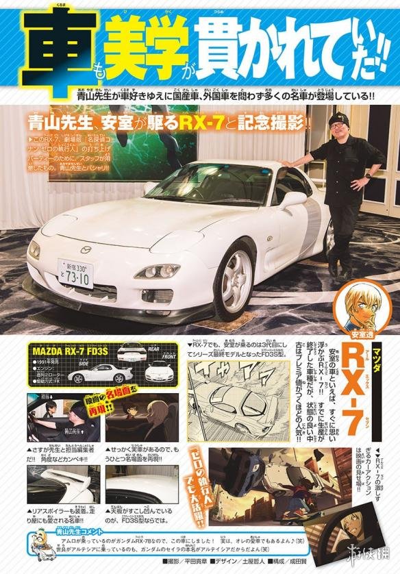 尽管青山刚昌玩舰娘休刊的黑历史成为许多人调侃的对象,但从杂志图情报来看这次他确实在为了取材而努力着。画面上,青山老师化身安室透,体验了一把安室爱车RX-7的魅力。在日本,马自达RX-7有着“女神”和“国宝级跑车”的美誉,《名侦探柯南》的故事里安室透与佐藤美和子警官均以RX-7作为座驾,非常拉风。