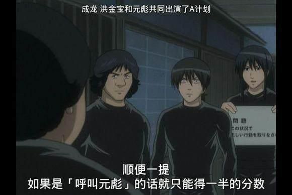 空知英秋也深受成龙系列作品的影响,小时候深受成龙游戏的影响。在《银魂》109集当中,这一集是恶搞成龙的《A方案》,不只仅有成龙,连洪金宝元彪两个师兄弟也恶搞了一把,其中还有骑自行车场景。恶搞成龙在《银魂》当中也是一种致敬吧。