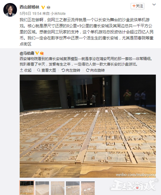 在2015年《剑网3》6周年发布会上,西山居公布了《剑侠情缘谢云流传》,由剑网3制作人郭炜炜亲自制作,游戏材质表现力接近真实照片,连同路边植被花瓣的纹理、人物肌理的毛孔都得到细致的呈现,游戏投资超过四亿致力打造一款中国沙盒武侠单机大作。消息一出立即引起国内玩家们的注意。