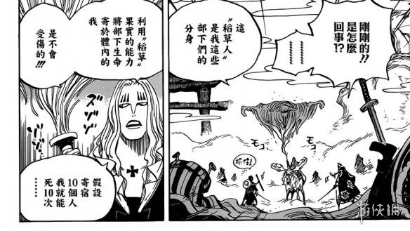 霍金斯使出造型奇特的“稻柄草刀”截杀了路飞丢过来的蜥蜴,之后又展示了“稻草”果实的能力,这些稻草人能承受他受到的伤害,甚至还可以代替他死亡。当然宿主就很凄惨了。