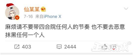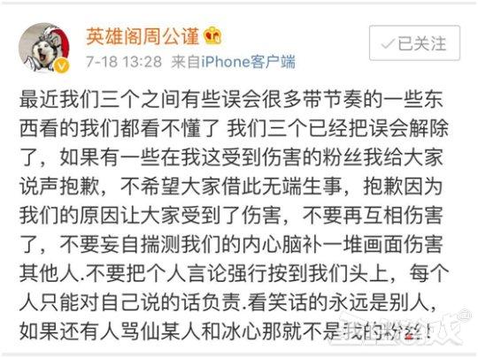 此前有传言“四盒院”关系出了问题,7月16日,仙某某发博表示不希望大家带四盒院的节奏,7月18日周公谨和仙某人发了相同的微博表示三人已经把误会解除了。