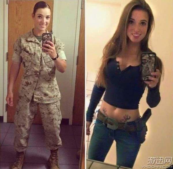 美军女兵在生活中都十分的时尚,脱掉军装外套后性感身材稍稍外漏。