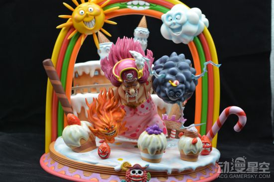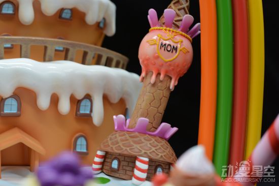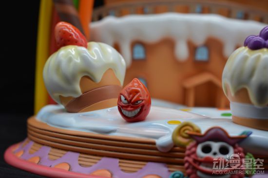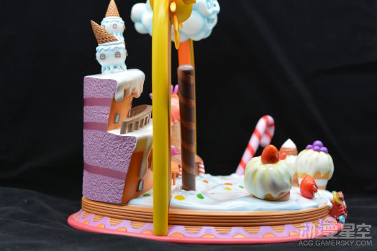 BIGMAMA统治的万国是一个她所构想出的童话世界,每个岛都代表了一种甜品,这也证明了MAMA对甜品的热爱。这次的地台主要将特色聚焦在了万国上,将各种各样的食材还原在了地台上。地台底座采用了奶油,仔细看的话还有快要化掉的痕迹。在地台上,零零散散的点注资和各种各样的小蛋糕、拐杖糖、蛋卷等各种甜食。背面的城堡这算是一块切开的大蛋糕,质感做的十分到位。