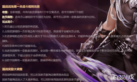 国战战场分为进攻方和防守方两大对阵方,进攻方以摧毁防守方国柱为目标,防守方以获得一定数量的资源为目标。简单来说,就是进攻的去抢矿,防守的去挖矿。