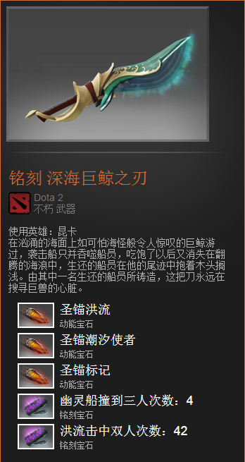除了VS的爪子外,船长的“鲸刀”也是TI3饰品中大家购买最多了一个了。因为他会让昆卡的二技能“洪流”释放时有一条鲸鱼涌出。