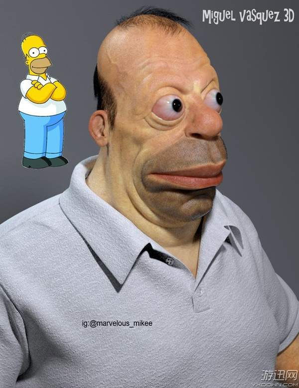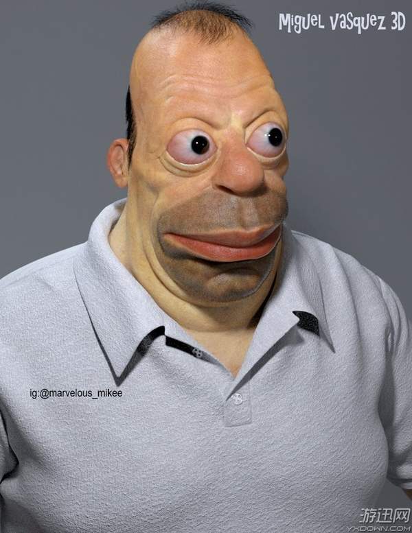 日前,国外艺术家“Miguel Vasquez 3D”把《辛普森一家》的主角Homer给3D“真人化”,硕大的嘴巴,强突的眼球,效果是相当惊悚啊!