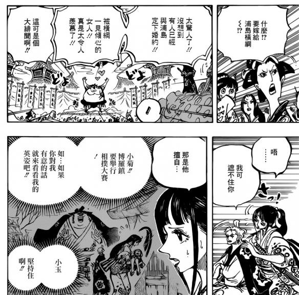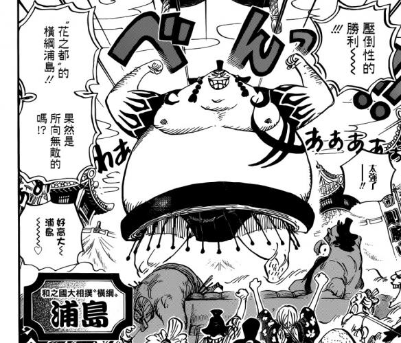 路飞他们虽然已经到了镇上,但是完全不知道小玉的下落。镇上正在举办相扑大会,横岗浦岛在这里所向披靡,小菊的出现,让他以为小菊是来和自己结婚的。之前他对小菊说如果对他有意就来看她的比赛,小菊到这里是为了救小玉的,碰到横岗浦岛纯粹是意外。浦岛让自己的手下带走小菊,索隆因为不想砍裸男所以并未阻止。