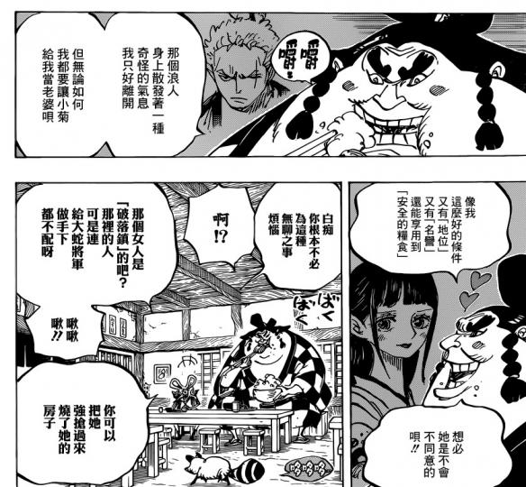 《海贼王》漫画915话汉化版公开了,这一集就是路飞他们弄出大事情之前最后的平静(虽然不是路飞弄得)。为了救出小玉路飞、索隆和小菊前往上层人士居住的博罗镇。这里居住着武士、力士还有匠人,之前纠缠小菊的那个相扑手浦岛是这里的贵族,此时他正在想办法将小菊弄到手。
