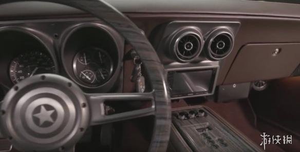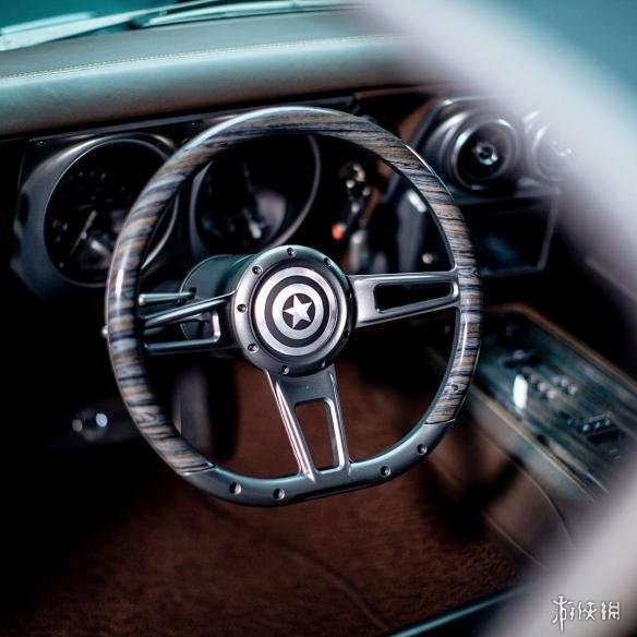 虽然是美国队长主题,但主题元素在这辆定制科迈罗身上并不很明显,并非直白的红白蓝配色,而是整体的军绿色,看起来像是《美队1》中还在当兵的罗杰斯,方向盘上有一个美队的银色盾牌LOGO,车内还有写着“1967科迈罗RS‘Steve Rogers’”的纪念板。