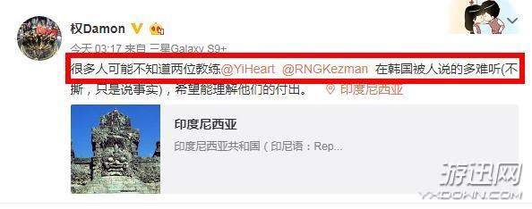 随后,就有人发现在昨天的凌晨三点,RNG的经理爆料RNG的两位教练在韩国受到很多非议,呼吁大家不要忘记他俩的功劳,因为很有可能他们连家都不能回了。这个爆料出来后,更是让人气愤的不行,大家都知道,这次孙大永和Heart教练确实是为中国队亚运会表演赛夺冠立下了汗马功劳,甚至在对阵中国台北的关键一战上,Heart还亲自上场参与了BP。很多玩家已经将他们视为中国队夺冠的功臣,这样的人,虽然不是中国国籍,但同样受到玩家的尊敬。