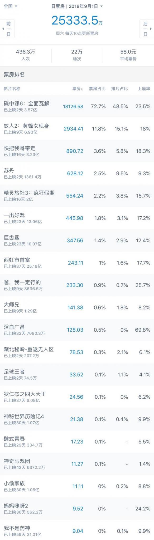 上映9天的《蚁人2:黄蜂女现身》受到压制,单日票房再收2934万,目前中国内地累计票房已破7亿。