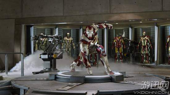在《钢铁侠3》中,钢铁侠大部分的时间都没有穿着自己的战衣。但是在影片最后的部分,铠甲部队拯救世界着实弥补了这一缺憾。铠甲部队都穿着斯塔克统一设计的战服,统一受钢铁侠的智能管家贾维斯的远程控制,钢铁侠穿铠甲打人是很好看,但是看不同的铠甲以不同的方式击倒敌人,总是给人耳目一新的感觉。