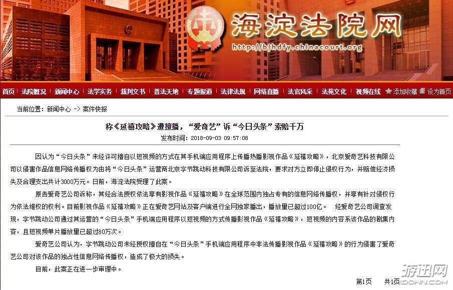 据北京市海淀区法院网消息,因认为“今日头条”未经许可擅自在今日头条手机客户端上传播热播影视作品《延禧攻略》,北京爱奇艺科技有限公司以侵害作品信息网络传播权为由将“今日头条”运营商北京字节跳动科技有限公司诉至法院。要求对方立即停止侵权行为,并赔偿经济损失及合力支出共计3000万元。日前,海淀法院受理了此案。