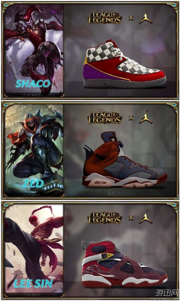 前段时间暴雪公布了《守望先锋》全新英雄款式的NIKE鞋,很是让玩家欣喜,那么如果推出《英雄联盟》英雄款式的鞋子,会是什么样呢?近日,一组《英雄联盟》角色联名的AJ鞋款照片引发网友热议,一起来看看先~