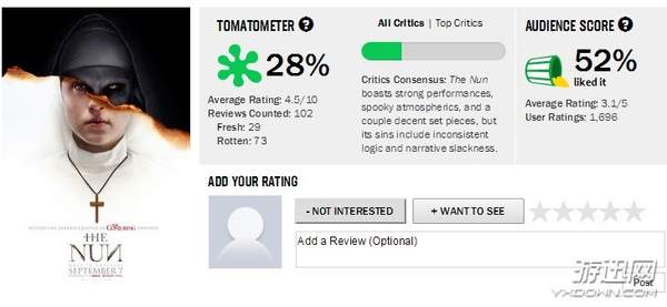 《修女》烂番茄新鲜度已从一开局的50%下滑至28%:29鲜73烂,口碑不佳,观众分数也没有及格。