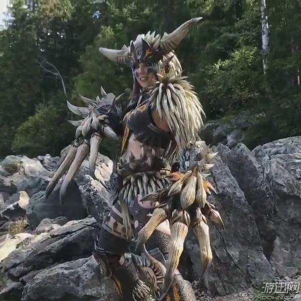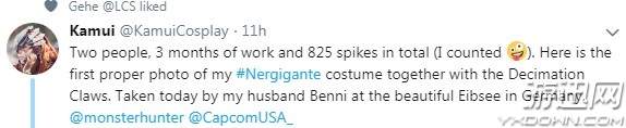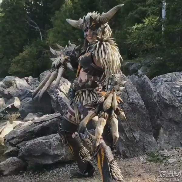 大神Kamui推特:2个人,3个月的劳作,总共825块尖刺(我数了)。这是首张我的灭尽龙套装和残灭之爪的正式照。今天由我的丈夫Benni在美丽的德国艾比湖拍摄。