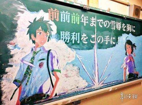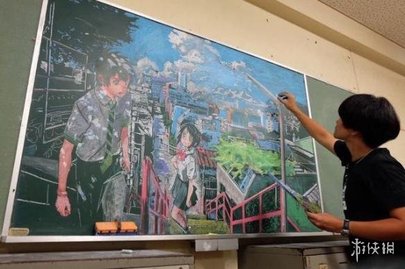 在日本奈良县立郡山高中,有一名美术老师叫做浜崎祐贵,之前在新海诚执导的动画电影《你的名字。》大火之后,他就参考电影的海报在学校教室的黑板上绘制了一幅还原度非常高的黑板画,这名老师将他绘制的作品上传到他的推特账号后,立马在日本网友中引起过一阵讨论的热潮。