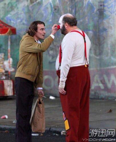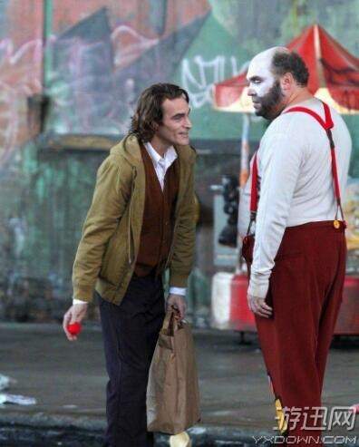 在片场照中,主演杰昆·菲尼克斯和一个小丑在街边相遇,似乎这个小丑将会对他的未来道路产生启发。此时杰昆还没变身,此时他还是一个正常人,遇见了一个小丑之后,还有兴趣和对方谈笑交流,看起来心情不错,不过也预示着他和小丑的命运终究会纠缠在一起。