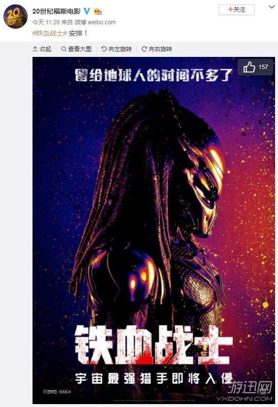 今天,20世纪福斯电影官方微博宣布,R级科幻动作片《铁血战士》已在国内过审,即将在中国内地上映。同时,官方还发布了一张全新海报,并配上了非常干脆的两个字——“安排!”!