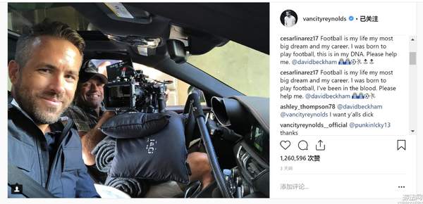 最近,大卫贝克汉姆这位足球偶像,表达了他对“死侍”演员瑞恩雷诺兹的狂热喜爱,并在对方Instgram上疯狂“示爱”。