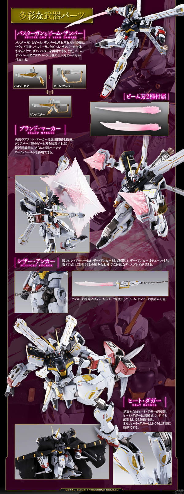 “METAL BUILD 海盗高达X1”还追加了原创的鹦鹉型侦查机械“比利”,全身各处装甲大量使用金色涂装。金色电镀点缀豪华的光辉,与合金材质的关节相辅相成,为模型增添金属般的厚重感。模型也以重新设计了原作中的丰富武装,拥有斩刀破坏枪、烙铁标识器(光束盾)、剪型锚、热能短刀等武装配件及特效零件,抗光束的ABC披风以布料织成,披风内部还有5处可动骨架可调整各种帅气的姿势。