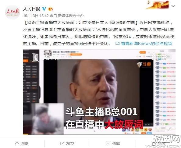 最近主播圈可谓是事故不断,虎牙莉哥前脚戏唱国歌,后脚斗鱼主播在直播口无遮拦。据人民日报官方微博消息,近日网友爆料称斗鱼主播“B总001”在直播时大放厥词:“从进化论的角度来说,中国人没有日韩进化得好;如果我是日本人,我也选择侵略中国。”目前,该直播间已被关闭。