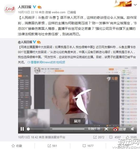 人民日报对此表示“斗鱼需‘斗愚’”:语不惊人死不休,这样的奇谈怪论令人发指。故作深刻,消费国仇家恨,这样的主播为何敢碰高压线?“陈一发事件”尚未尘埃落定,“B总001”接着伤害国人情感,直播平台岂可安之若素?“强化公司及平台旗下主播的法律法规教育与社会责任感”,别说说而已。