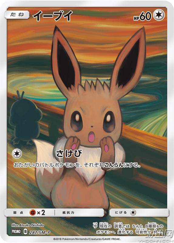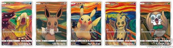 《呐喊》是蒙克的著名画作,蒙克先后共推出了蛋清模板画、彩蜡木板画、彩粉木板画、蛋清木板油画四种版本,本次的5张宝可梦集换式卡牌同样分别还原了不同的作画材质,“呐喊的人”分别被替换成皮卡丘、伊布、可达鸭、迷拟Q、木木枭,看上去他们都因为身后的其他宝可梦的威胁而发出尖叫,并且他们的技能也全变成了“呐喊”。