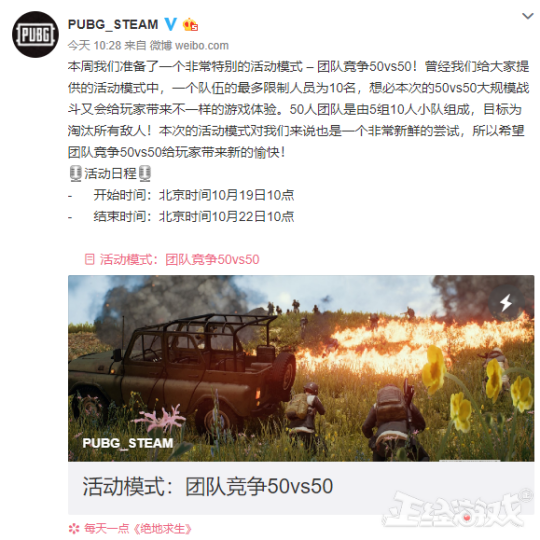 绝地求生官方今天在微博宣布了一个小弟,将在北京时间10月22日10点整,上线全新的玩法——团队竞争50vs50。