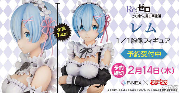 《从零开始的异世界生活》雷姆超大胸像全高约为70厘米,胸像按照预约来发售,目前已经开始预约,售价为234000日元(约为人民币14435元),将于2019年2月14日停止预约。其实这样的胸像差不多就是等身手办的大小,而且制作感觉要比等身手办还要精致,十分适合收藏。
