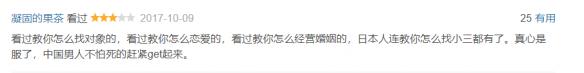 当然也有不少人又说三观不正的事儿了,不过日剧被指责三观不正是家常便饭。本来就是一部深夜搞笑福利番,看出人生感慨那是不可能的,认认真真学一学怎么钓妹子还是有希望的。