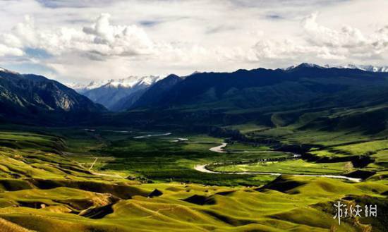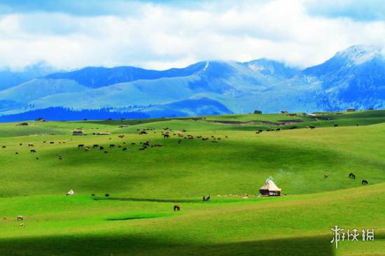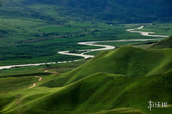 草原与低矮的山脊连接在一起,线条丰富且柔和,广阔的草原宛如一块柔软的地毯,形成一道奇特的风景线。