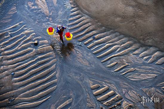 大自然赐予它千变万化的景致,随着潮涨潮落、风吹浪打的洗礼,泥沙冲击的海滩变化成岁月的涟漪。