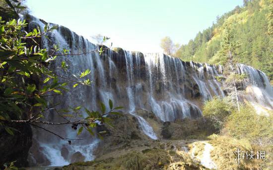 瀑布被形如新月的岩体分割为数股,狂奔急泻汇入涧底,喧腾着奔流而下。它是九寨沟所有激流中水色最美,水势最猛,水声最大的一段。