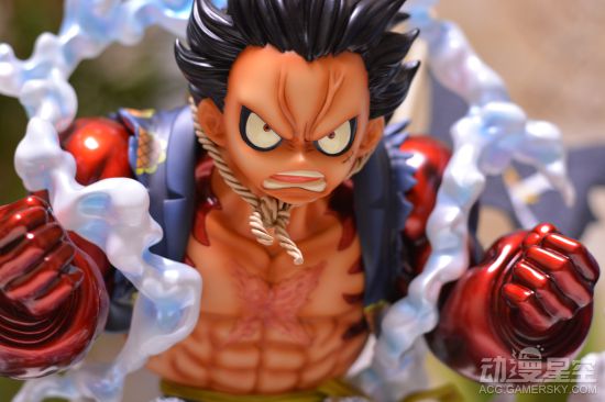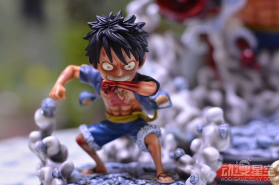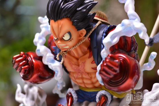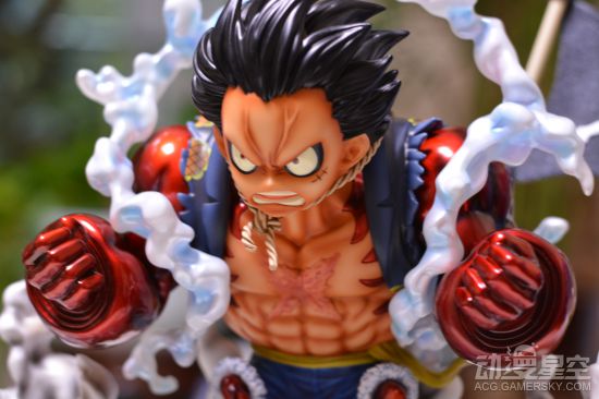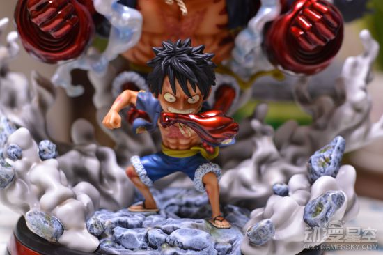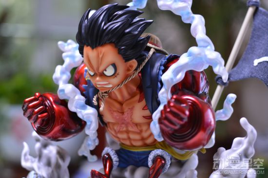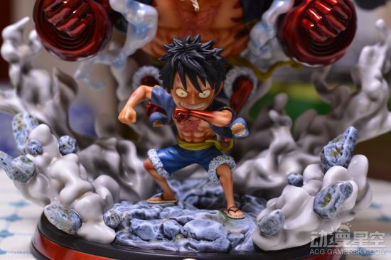 这款雕像制作十分精美,普通版的路飞正在往手臂的肌肉中吹气,并且有一个没有充气替换手。后面的变身完成的四档路飞则呈现出霸气应敌的姿态,漂浮在半空,身后还有草帽海贼团的标志旗子。周围环绕的烟雾特效件也是制作的十分精细,连散落其中的碎石都没有落下。