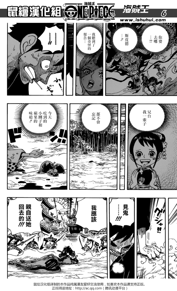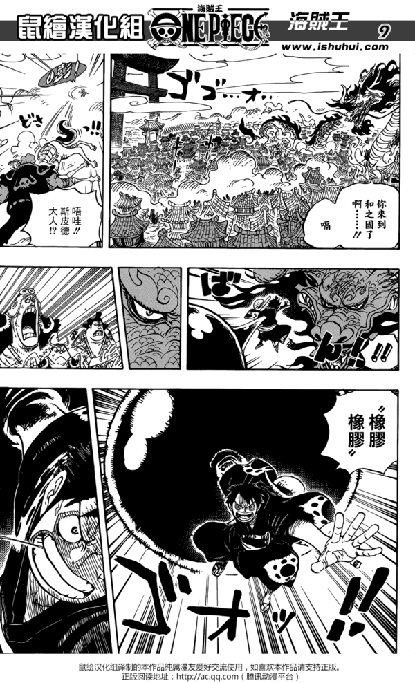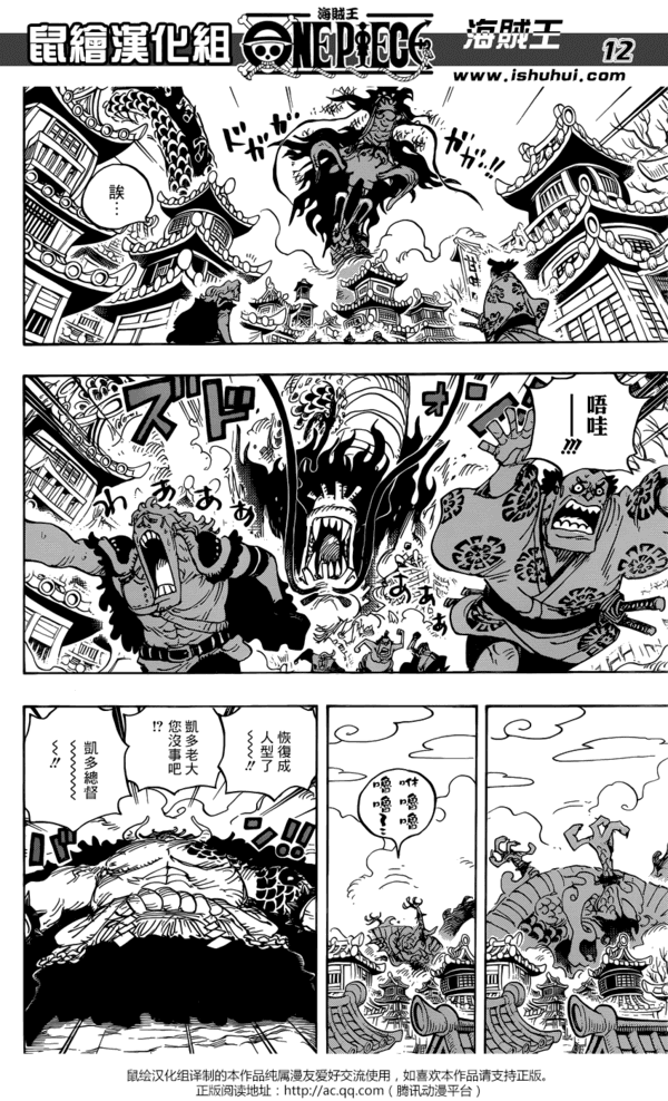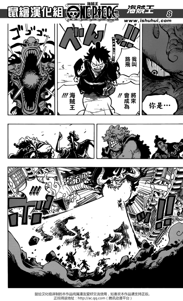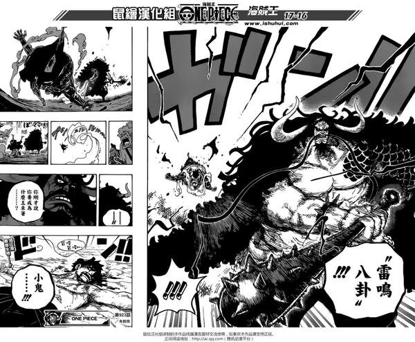 《海贼王》漫画923话汉化版公开,这集中路飞正面和凯多对决,但是凯多怎么说也是四皇之一,实力绝对不容小觑。看到龙形凯多将御田城遗址吹飞,心急如焚的路飞将凯多打了下来。正在往回赶的时候,他突然发现送小玉回家的马妹子斯皮德全身是伤的倒在地上,斯皮德告诉路飞她们在回去的路上碰到了凯多...愤怒的路飞向凯多挑战。