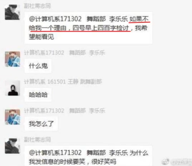 说近日,江苏省盐城技师学院一学生,因在群内回复学生干部“哈哈哈”三字,被罚写400字检讨。盐城技师学院团委称,该学生干部出发点是加强管理,但措辞生硬伤害同学,校方已对其批评教育。