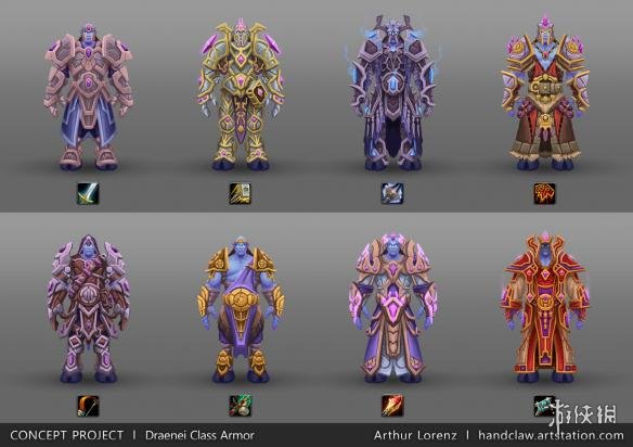 职业套装有战士、圣骑、猎人等多种职业,完全符合种族特色,同时也切合世界观设定,排列在一起非常有制式装备的感觉。除此之外,Arthur Lorenz也打造了地精、狼人、食人魔、血精灵等种族的特色职业套装,非常亮眼。