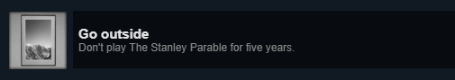 前阵子有一个新闻让我眼前一亮。说是在《史丹利寓言》五周年的当天,官方更新了个新成就:出去走走(Go outside)。获得这个成就的条件可以说是“成就”系统问世以来最严苛却又是最简单的:5年没有开启过游戏即可自动获得。