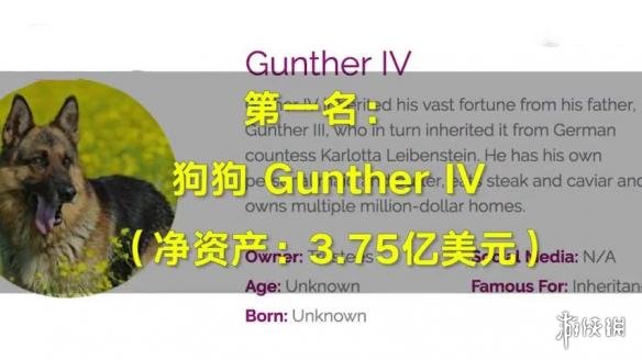 位列宠物富豪榜榜首的是一只名叫巩特尔四世(Gunther IV)的德国牧羊犬,它坐拥3.75亿美元(约合人民币26亿元)的资产。巩特尔四世之所以这么有钱,是因为它继承了父亲巩特尔三世(Gunther III)的财产,而巩特尔三世的财产则是从它的主人奥地利伯爵夫人卡洛塔(Karlotta Leibenstein)那里继承来的。