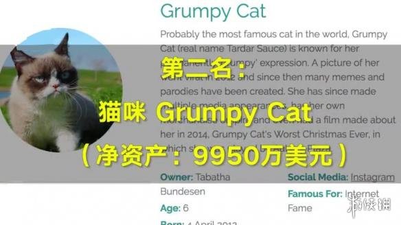 富豪榜的第二名是一只名叫塔达尔(Tardar Sauce)的猫咪,它可是一位白手起家的“千万富翁”。这只六岁的混血猫,因其冷峻的外表走红网络,坐拥9950万美元(约合人民币6.9亿元)的财产。塔达尔不仅拍广告,还在2014年主演过一部名为《不爽猫最糟糕的圣诞节》(Grumpy Cat‘s Worst Christmas Ever)电影。