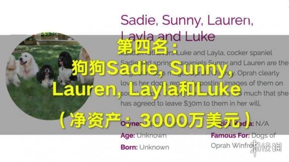 第四名是美国脱口秀主持人奥普拉(Orpah Winfrey)的5只宠物狗。据悉,奥普拉已经在自己的遗嘱中留给她的这些宠物共3000万美元(约合人民币2亿元)的财产。