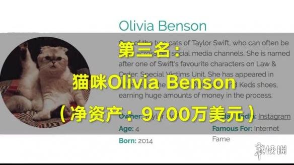 富豪榜第三名是美国知名歌手泰勒⋅斯威夫特(Taylor Alison Swift)的宠物猫奥莉维亚(Olivia Benson),拥有约9700万美元(约合人民币6.7亿元)的财产。
