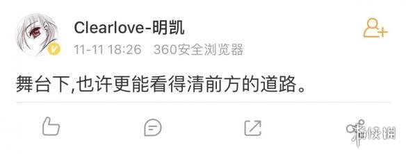 “刚看到@Clearlove-明凯的微博,他的微博下面转发评论不了这么多字,所以干脆发在我这里吧,@Clearlove-明凯一下他,希望他能够看到这段话。 诺言,我倒是挺希望你能够继续打下去的,因为到现在你也不过才20多岁,英雄联盟也正当火热,你的人生还有大几十年之久,一旦你选择了离开,我想再回来的难度一定很大,更何况如果离开的久了,假设再回来时英雄联盟也变得和曾经的星际争霸1,魔兽争霸3一样日落西山,那个时候就算你想打职业也没机会了。所以心里有梦就继续坚持,人生谁没有点低谷,更何况你所取得成就已经是大多数人可望不可及的了,希望你能够坚持到最后一刻!”