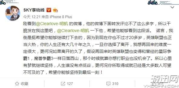刚看到@Clearlove-明凯 的微博,他的微博下面转发评论不了这么多字,所以干脆发在我这里吧,@Clearlove-明凯 一下他,希望他能够看到这段话。 诺言,我倒是挺希望你能够继续打下去的,因为到现在你也不过才20多岁,英雄联盟也正当火热,你的人生还有大几十年之久,一旦你选择了离开,我想再回来的难度一定很大,更何况如果离开的久了,假设再回来时英雄联盟也变得和曾经的星际争霸1,魔兽争霸3一样日落西山,那个时候就算你想打职业也没机会了。所以心里有梦就继续坚持,人生谁没有点低谷,更何况你所取得成就已经是大多数人可望不可及的了,希望你能够坚持到最后一刻!