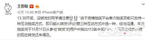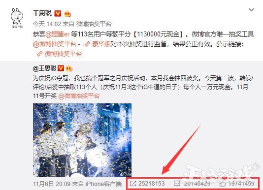 这条抽奖微博也是王思聪为了庆祝IG战队夺得S赛冠军而特地发起的抽奖活动,因为IG战队夺冠的日子是11月3日,所以也是特地抽取共113位幸运儿瓜分113万元的奖金,每人一万元。参与的条件起初是转发、评论和点赞,不过因为微博抽奖限制,最后只是抽取的转发用户。