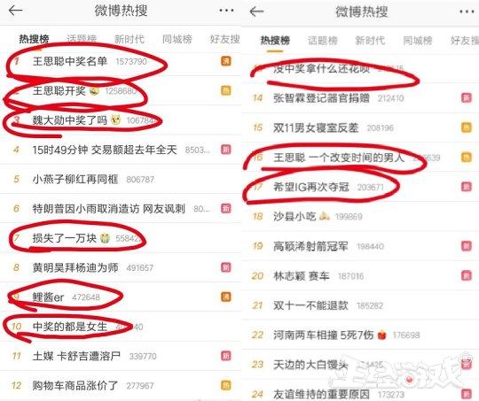 而王思聪这条抽奖微博竟然在当时整个的微博热搜排行榜中占据9条,大多数都是以“王思聪中奖名单”“痛失一万块”等出现,由此可见这也带动了网友们的抽奖中奖热门话题。