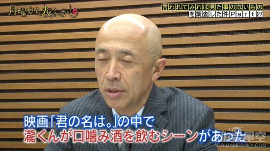 律师菊地幸夫受日本电视台的综艺节目“月曜から夜ふかし”之邀,解答动画中可能牵涉的各种法律问题,其中一个问题就是关于2016年的动画电影《你的名字。》中的口嚼酒,这个口嚼酒问题可大了。利用口中的唾液改变淀粉再自然发酵的口嚼酒曾在电影播出以后引发关注,不过问题的核心不在于卫不卫生,而是口嚼酒到底算不算“酒”。如果算的话,电影中的泷喝了口嚼酒,当时泷还只是高中生,所以违反了未成年者禁酒法。由于日本的“未成年者饮酒禁止法”规定20岁以上才可以饮酒,因此泷明显犯法了。